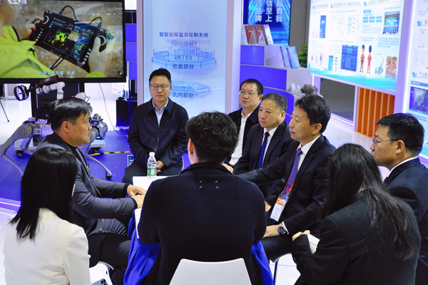 大会开幕式前,许大纯一行巡展时来到总局展台,听取了王文军关于总局矿产资源开发与未来勘探系统有关情况的汇报。